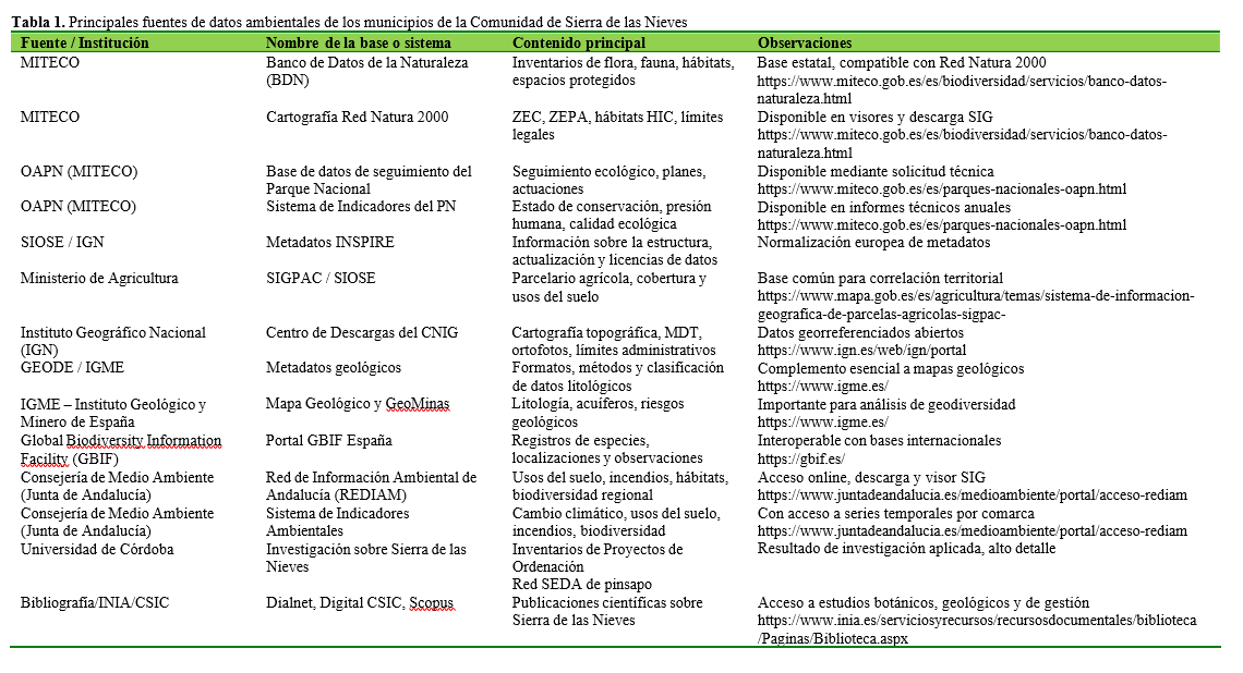 La primera fase del trabajo en Sierra de las Nieves se centró en la recopilación, depuración y estandarización de las fuentes de información forestal disponibles, con el objetivo de construir una base de datos integrada y coherente que sirviera de soporte a la gestión sostenible del territorio. Para ello, se reunieron datos procedentes de distintos organismos y programas, entre ellos el Inventario Forestal Nacional (IFN-MITECO), el Plan Nacional de Ortofotografía Aérea (PNOA), los inventarios de ordenaciones forestales y la Red de Información Ambiental de Andalucía (REDIAM), así como otras fuentes complementarias de teledetección y cartografía temática (Tabla 1).