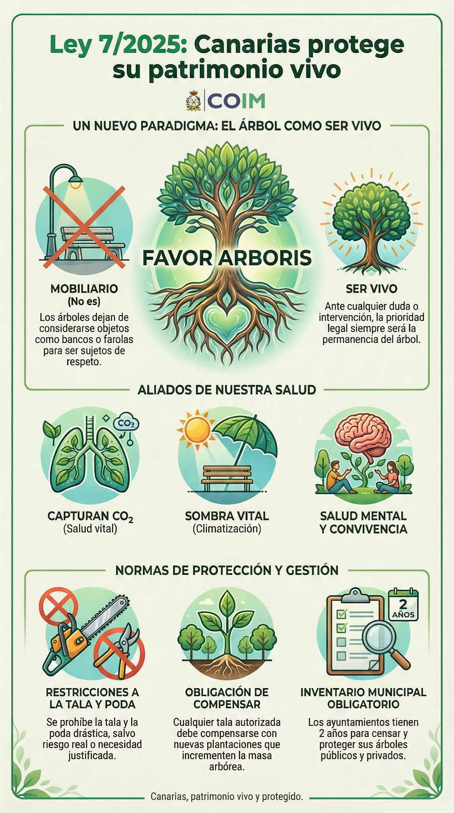 La entrada en vigor de la Ley 7/2025, de 16 de diciembre, de protección del arbolado urbano y del arbolado de especial protección de Canarias, representa un cambio de paradigma imperativo en la planificación de nuestras ciudades. En un escenario de emergencia climática donde más del 60% de la población canaria reside en núcleos urbanos, el arbolado ha dejado de ser interpretado como un mero elemento ornamental o "mobiliario urbano" —equiparable a luminarias o bancos— para ser reconocido legalmente como un activo esencial de salud pública y resiliencia. Este marco normativo blinda al árbol por su capacidad de captura de CO2, regulación térmica frente al efecto "isla de calor" y su rol como soporte de biodiversidad urbana.